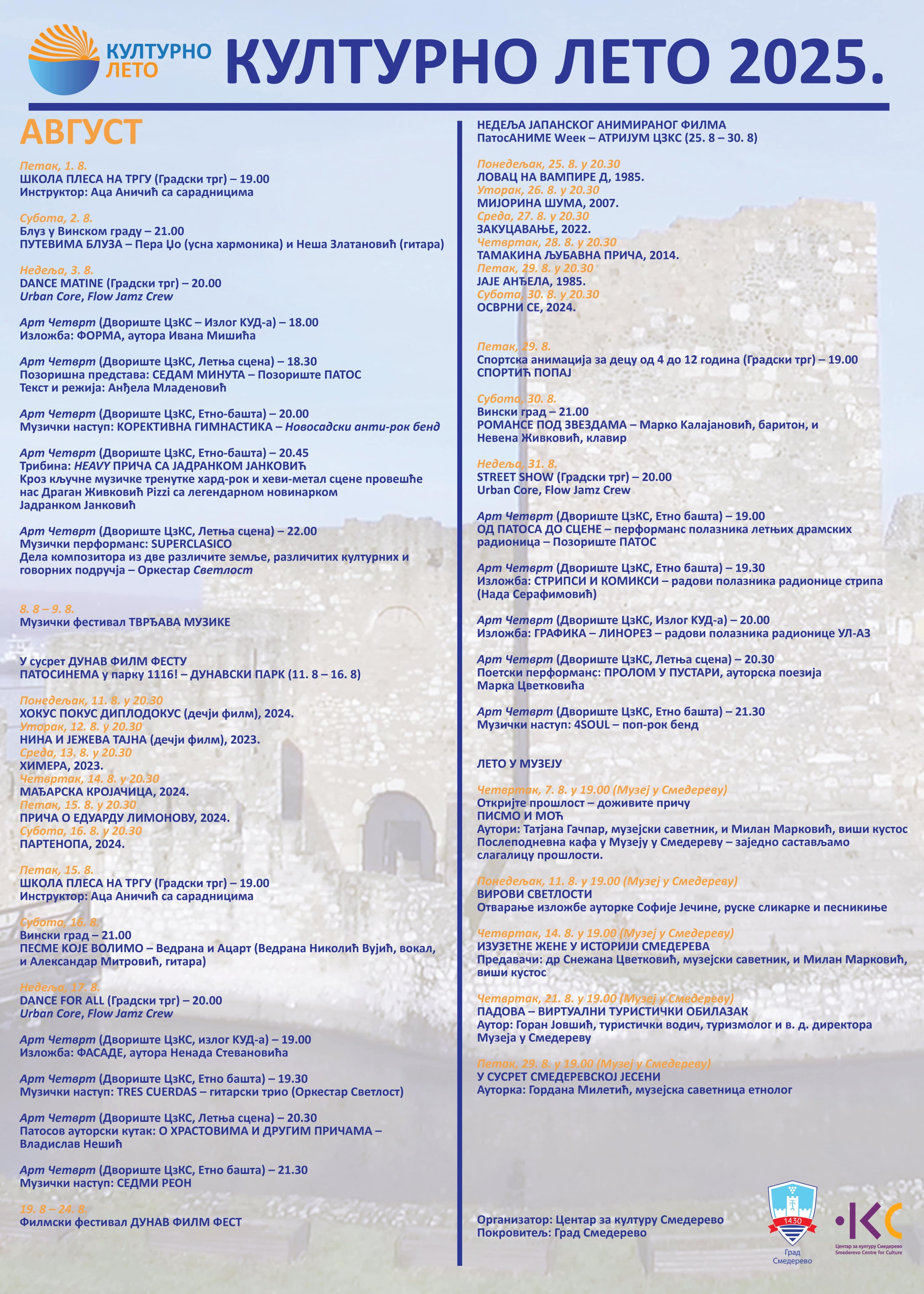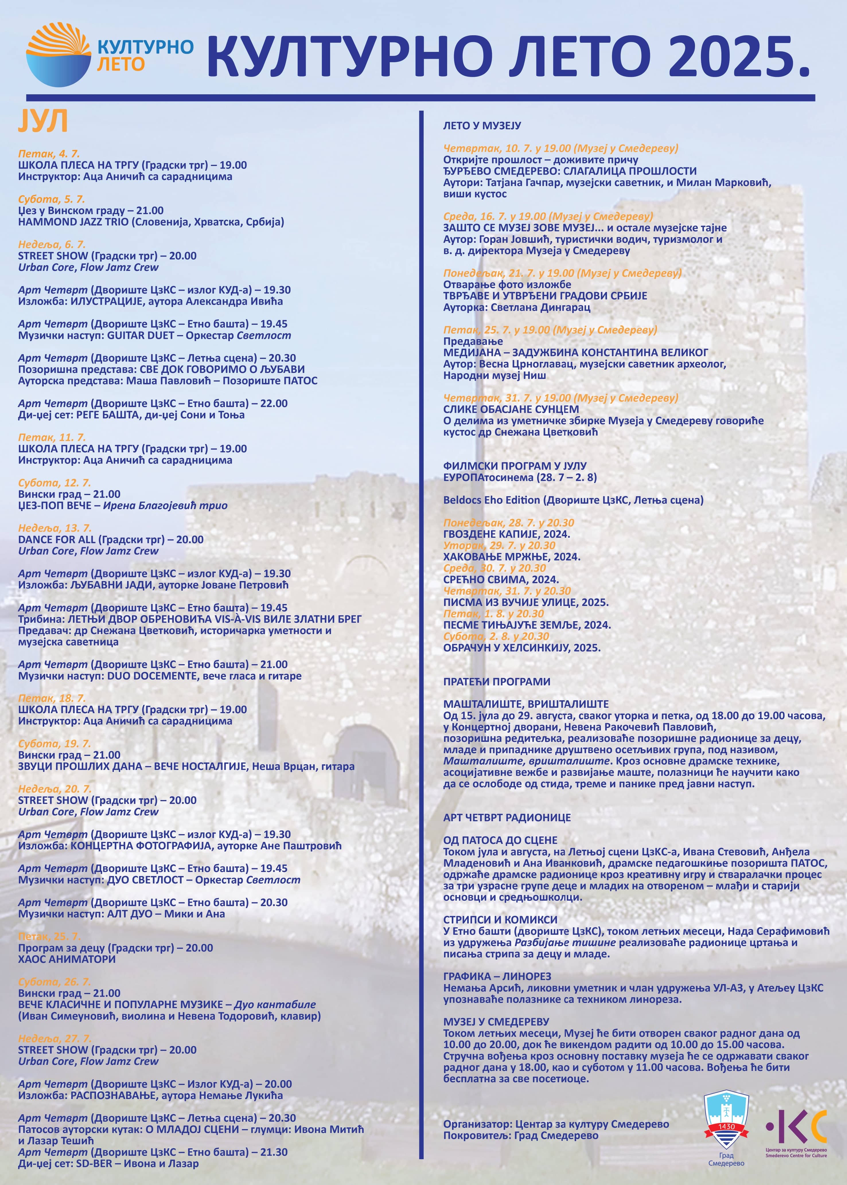 Лето у Смедереву добија нови сјај уз манифестацију „Културно лето“ – низ догађаја који осликавају атмосферу града у најтоплијим месецима. Ово је време када се сваки тренутак проводи уживајући у уметности, култури и доброј забави, баш онако како само лето уме да пружи. Без обзира да ли волите позориште, музику, плес, филм или ликовну уметност, „Културно лето“ нуди богат избор програма који ће задовољити свачији укус.