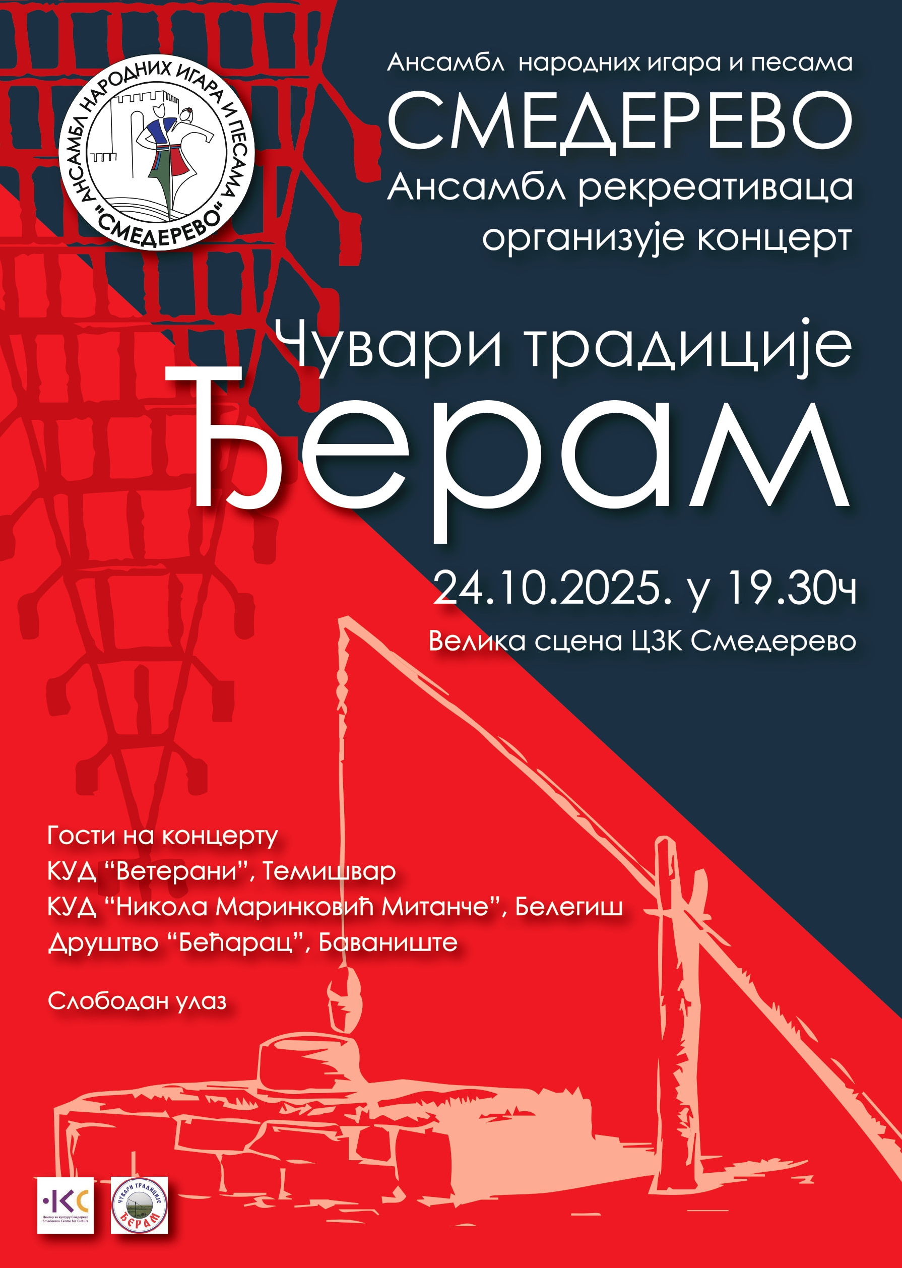 Улаз на концерт је слободан, те позивамо све љубитеље фолклора и народне уметности да својим присуством подрже чуваре традиције и уживају у богатом програму.