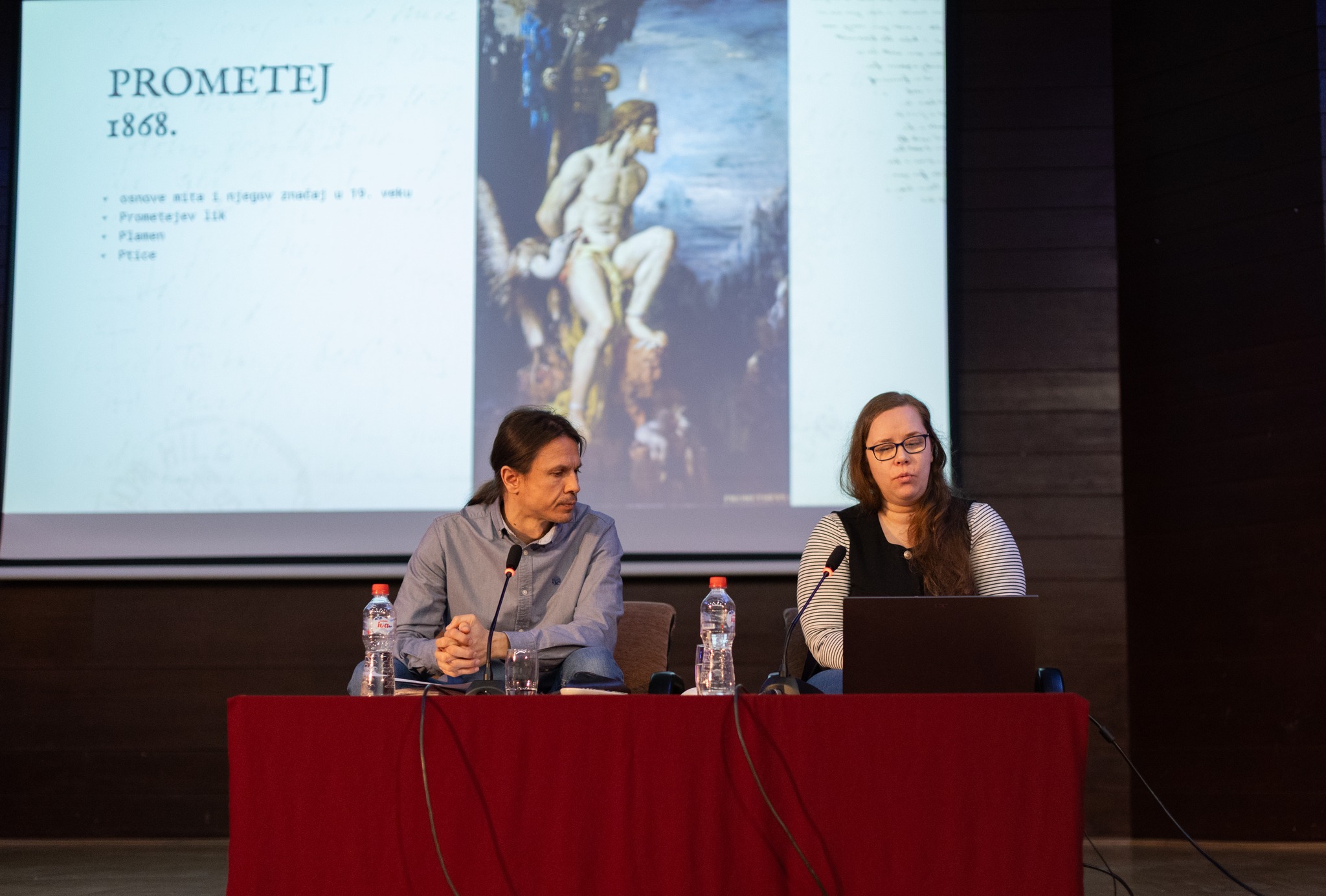 Предавање „Античке теме у сликарству симболизма – Гистав Моро” које је 12. марта одржала др Јована Николић, историчар уметности и научни сарадник на Институту за историју уметности при Филозофском факултету у Београду, истакло је особености израза и однос према уметности јединствене и изузетно значајне ауторске појаве у сликарству 19. века, Гистава Мороа, у чијем опусу античке теме заузимају знатан део. Како је показано током програма, Моро се у стварању држао традиције академског и историјског сликарства, али је био оригиналан и инвентиван у приступу античким митовима које је тумачио у симболистичком кључу. Митови су били полигон за испитивање унутрашњаг света, човековових тежњи, снова, позиције и судбине уметника и уметности, као и проблематизовања друштвених појава доба у коме је сликар живео. Кроз анализу одабраних композиција, Јована Николић је истакла кључне теме којима се Моро бавио инспирисан светом античких божанстава, хероја, антихероина. Слика „Просци” на којој Моро представља масовну смрт Пенелопиних просаца доноси визију деловања хероја који кажњава и успоставља ред уз присуство Минерве као заштитнице, док дело „Прометеј” приказује кажњеног хероја, доносиоца просветљења и чувара цивилизацијских тековина, смиреног, узвишеног и христоликог, мученог од стране лешинара, уместо од стране орла. Направљен је осврт и на слике „Орфеј” који је за Мороа био персонификација идеалног уметника, на симболику лире и Орфејеве главе, и на разлику аполонијског и дионизијског у схватању стварања. Указано је и на специфичности визије Орфеја на слици „Орфеј на Еуридиконом гробу”. У бављењу делом „Едип и сфинга” као кључни чинилац истакнуто је одолевање искушењу, пожуди, заводљивости, тријумфу интелекта над анималном и ирационалним. Фатална жена као једна од важних тема у Мороовом сликарству обрађена је на примерима његових слика „Јелена на зидинама Троје” и „Јелена на вратима Сека”, које, свака на свој начин, представљају смртоносно дејство деспотске, ужасне лепоте. Завршница излагања припала је анализи комплексне, раскошне и детаљима богате композиције „Јупитер и Семела”, моћном представом апотеозе, преображаја, идеализације, прочишћења и успона у вишу сферу кроз визуелни приказ хијерахије принципа, на коме видимо хтонски, мрачни свет, као и небеску, идеалну сферу. Као идеја и порука од суштинске важности у Мороовом бављењу митским бићима и античким темама изражена је борба духа над материјом и победа духовног идеала над материјалним.