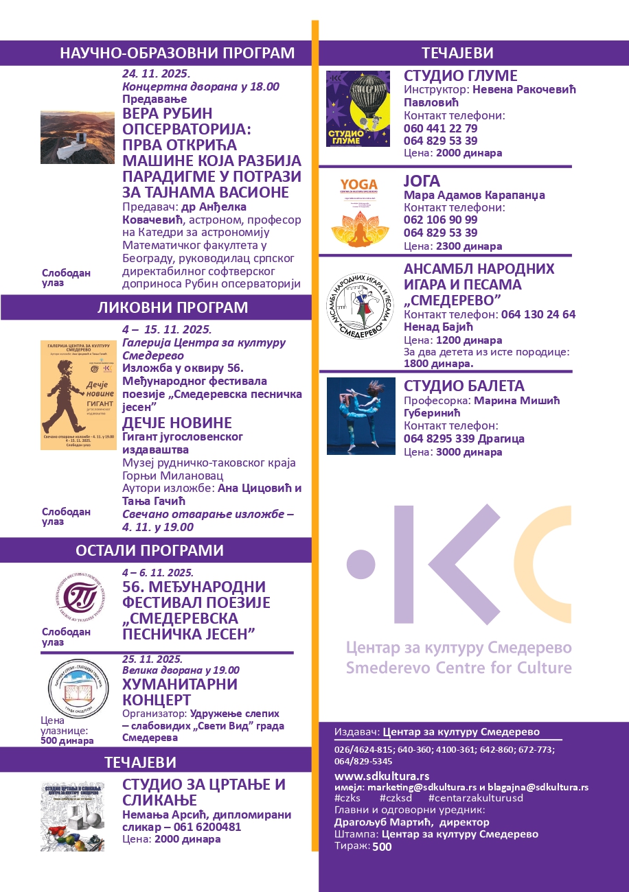 Новембар у Смедереву тако ће понудити богат спој уметности, музике и знања за све генерације.